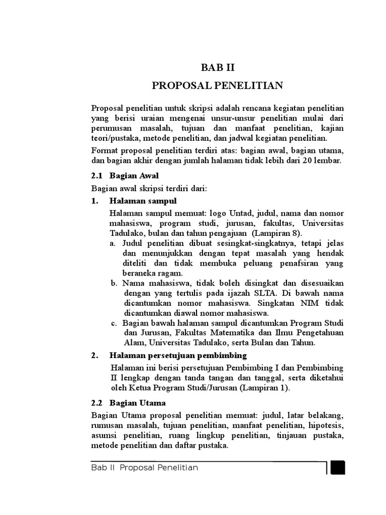 14 Pembimbing Skripsi-Nonskripsi 2 BAB II PROSES PENYUSUNAN SKRIPSI-NONSKRIPSI 4 21 Tahap Proposal BAB I-III 4 22 Tahap Penulisan Skripsi-Nonskripsi 6. BAB 2 SOROTAN KAJIAN LITERATUR 20 Pengenalan Dalam bab ini pengkaji akan membincangkan teori-teori yang berkaitan dengan pemerolehan dan pembelajaran bahasa dalam kalangan kanak-kanak atau murid-murid sekolah rendah dasar dan pelaksanaan bahasa Arab dalam program j-QAF dan juga. Penulisan Bab-Bab dalam Proposal Tesis Dalam penulisan proposal tesis ia melibatkan tiga bab iaitu Bab 1.